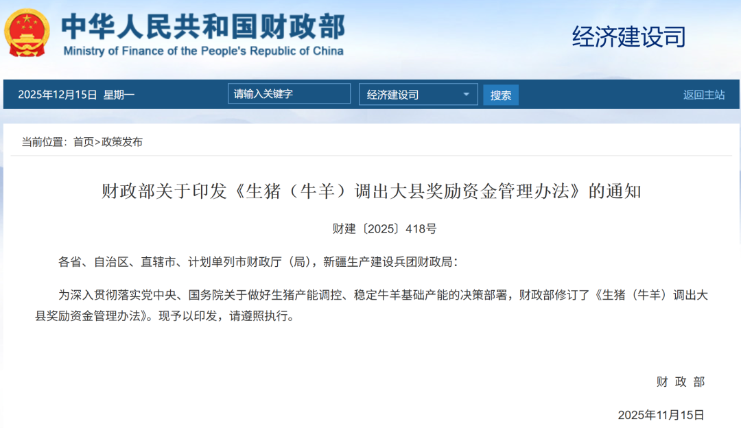 财政部关于印发《生猪(牛羊)调出大县奖励资金管理办法》的通知